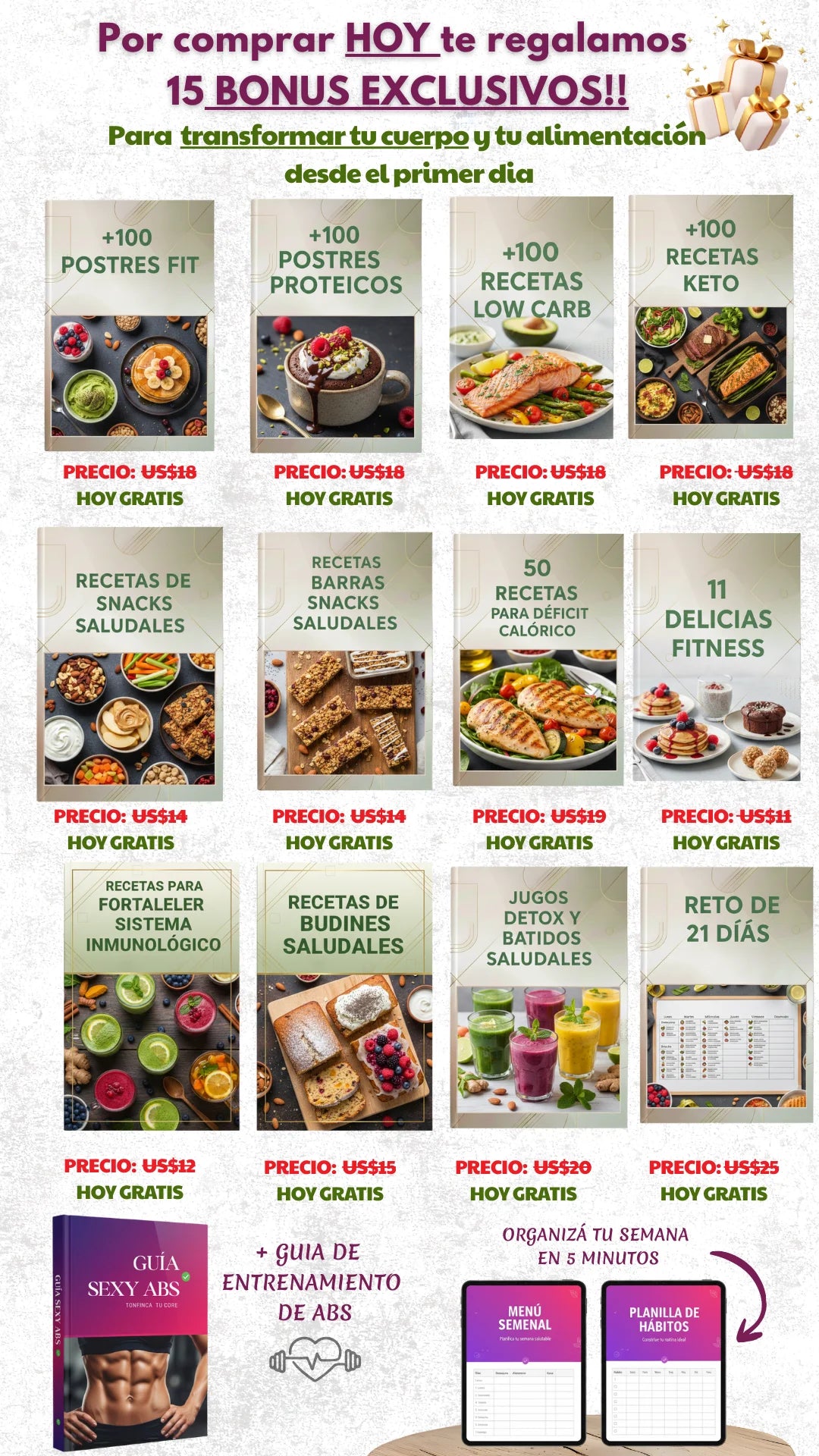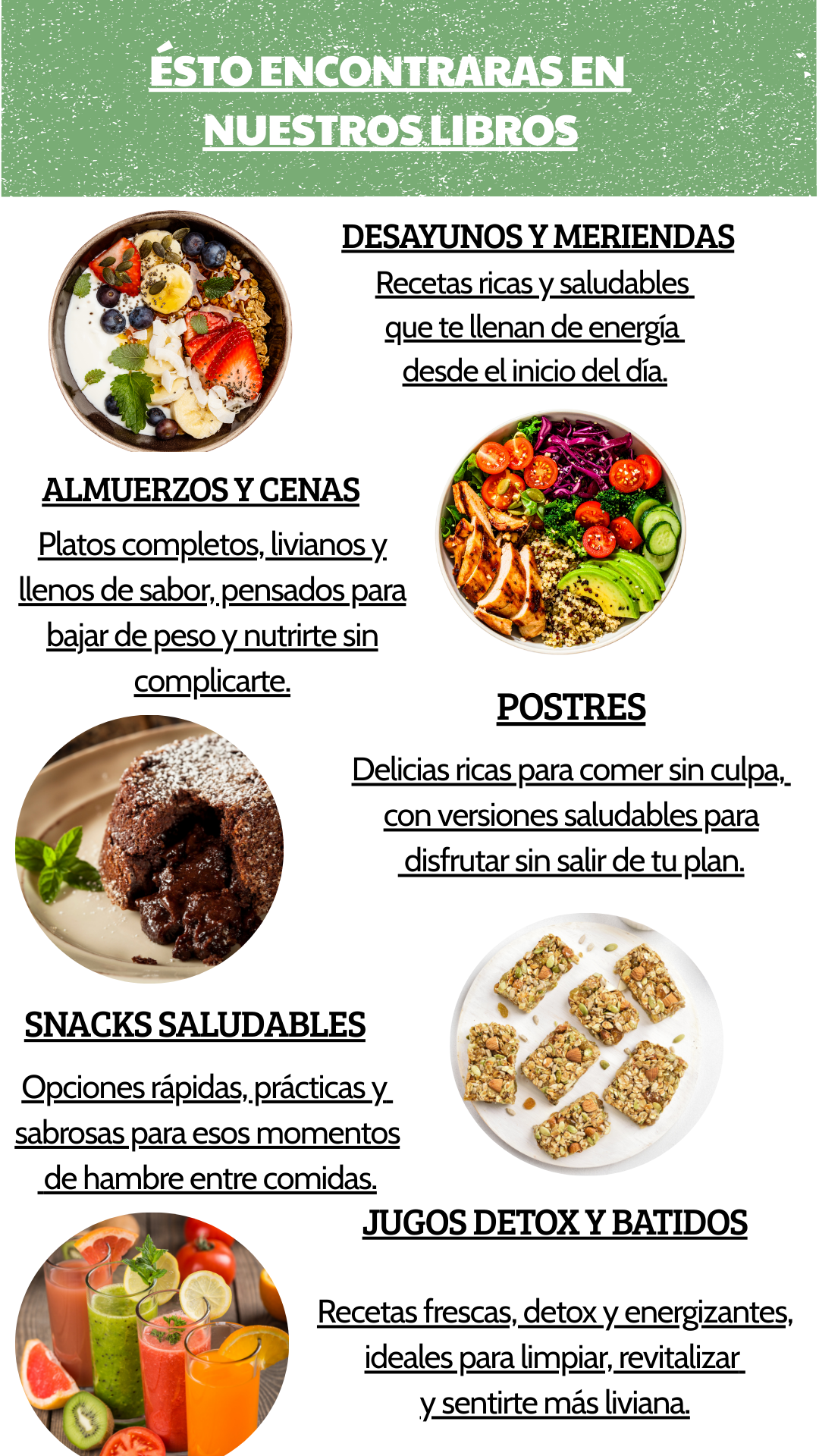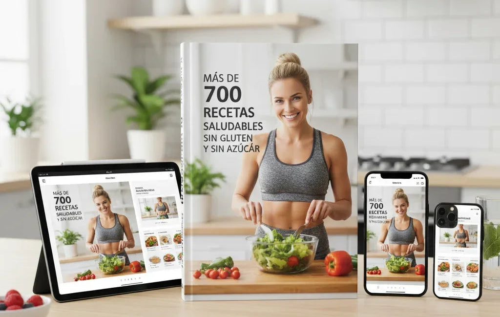 El pack incluye el e-book “700 Recetas Saludables” con desayunos, almuerzos, cenas, snacks y postres, además de los bonos de regalo! con guías, retos y recursos adicionales para ayudarte a transformar tus hábitos y mejorar tu bienestar.